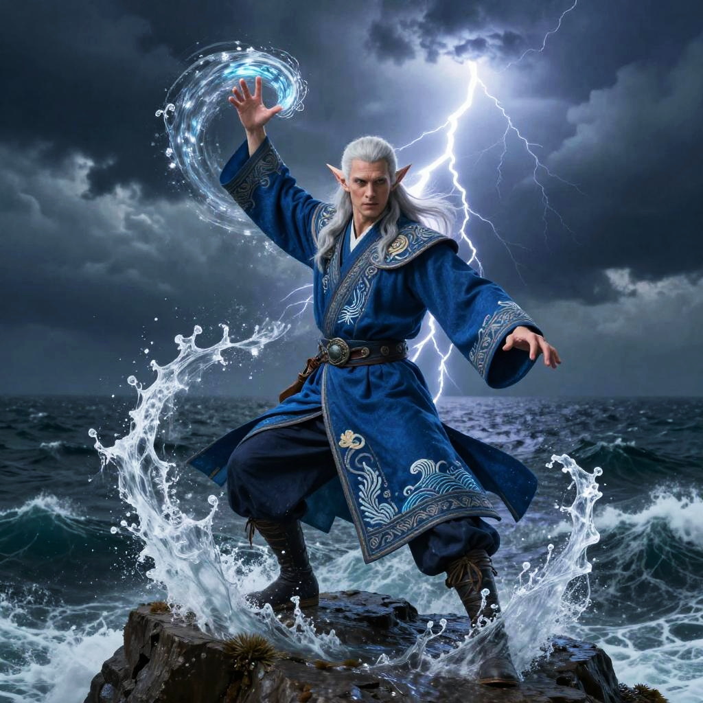 5e sea elf mage manipulating swirling water magic atop a cliff overlooking the stormy sea, robes embroidered with ocean symbols, powerful and focused expression, lightning illuminating the dark clouds behind, dramatic and epic fantasy visual, high detail