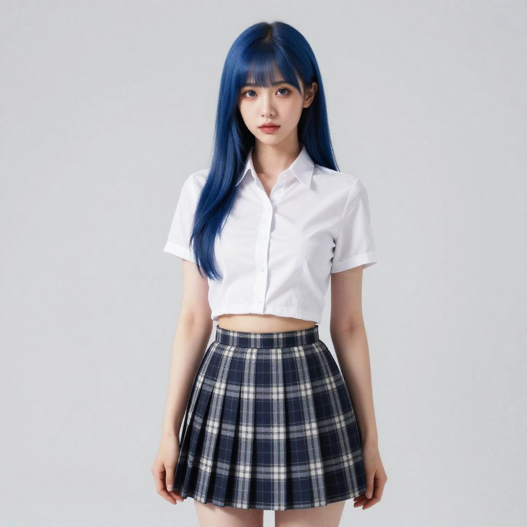 Photograph of an Asian woman with vibrant blue hair, styled straight and falling to her shoulders. She is on all fours on a grassy park, wearing a black sleeveless dress with a white Peter Pan collar, white knee socks, and black loafers. Her expression is neutral, and she gazes directly at the camera. The background is blurred, featuring green trees and a hint of a white structure. The grass is lush, with scattered brown leaves. The image has a shallow depth of field, emphasizing the subject while the background remains out of focus.