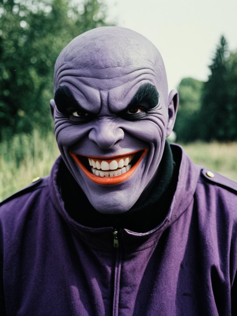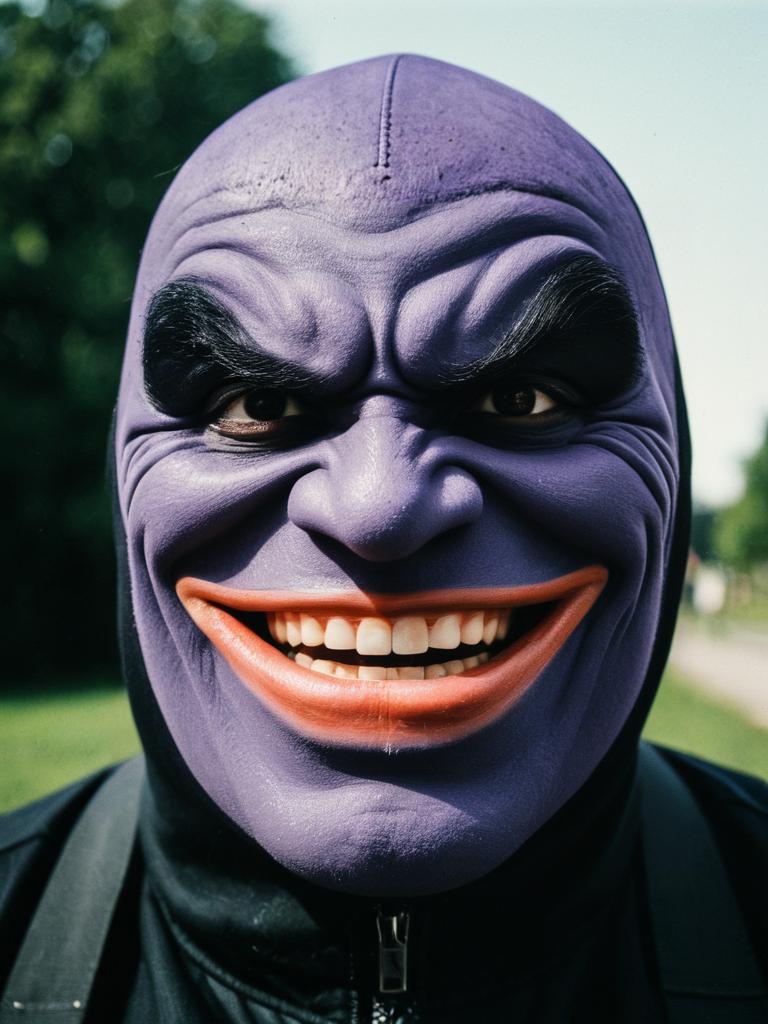 Man in Grimace Costume, photorealistic outdoor portrait, daylight