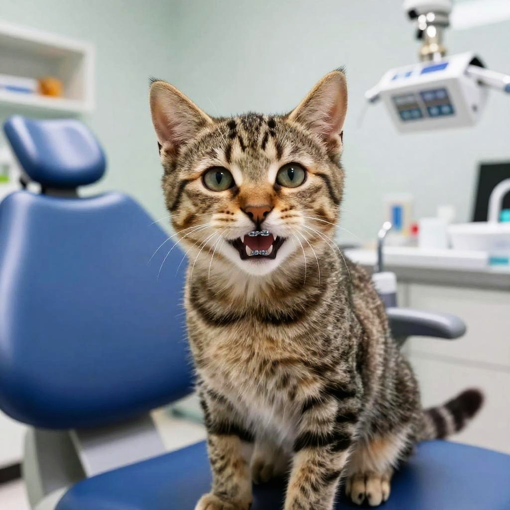 Cat with braces, cute tabby kitten smiling with shiny silver braces on its teeth, sitting in a colorful dentist office, soft lighting, high detail, playful atmosphere