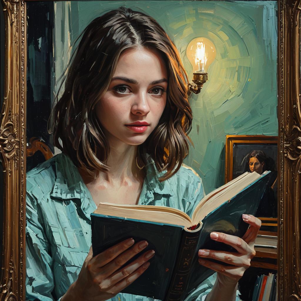 Highly detailed expressionist oil painting of a young woman with shoulder-length brown hair reading a book. The artwork features impasto technique and pastel shades, with rough canvas texture and loose brush strokes. The subject wears a teal shirt and is lit from above by a single light bulb. In the background, a framed portrait reflection echoes the reading figure, enhancing the dynamic composition. This digital-inspired painting captures realistic and hyper-detailed facial features and eyes, blending traditional oil painting style with digital concept art influences.