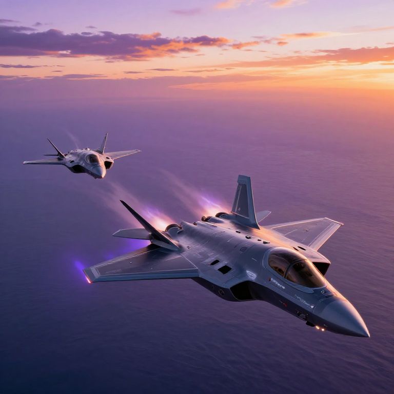 Stealth futuristic fighter jets engaged in an aerial dogfight above a vast ocean during sunrise, cutting-edge aerodynamic designs with plasma thrusters, energy shields visible around the jets, vibrant palette of purples and oranges, highly detailed and action-packed sci-fi scene.