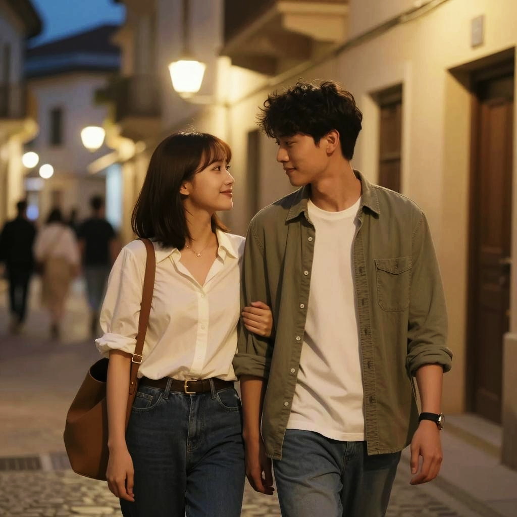 A young Asian couple walking closely arm-in-arm on a charming, dimly lit street during the evening. The woman is wearing a white blouse with rolled-up sleeves, blue jeans, and carrying a brown shoulder bag. The man is dressed casually in a white t-shirt layered with an olive green button-up shirt and blue jeans. Warm street lights illuminate the background, highlighting their affectionate expressions.