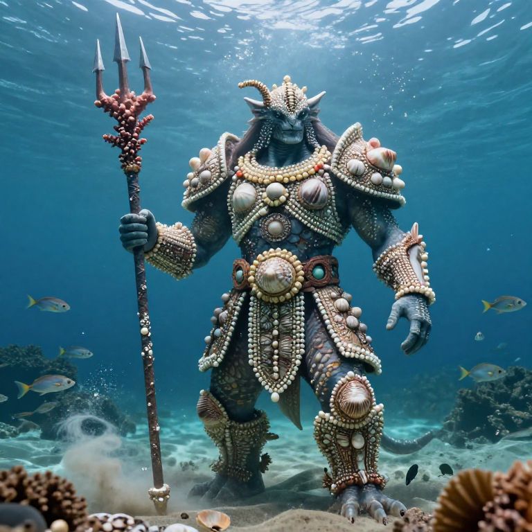 Powerful humanoid sea creature warrior adorned with ancient tribal armor made of seashells and pearls, holding a trident forged from coral, standing tall on the ocean floor surrounded by swirling sand and schools of fish, dramatic lighting, fantasy realism style.