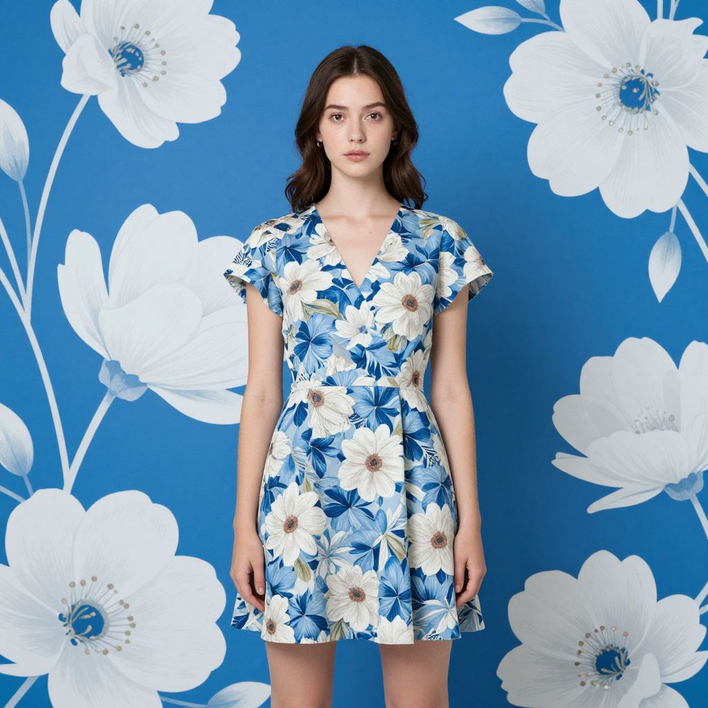 A young woman stands confidently against a vibrant blue backdrop adorned with large white flowers. She wears a matching floral dress that blends seamlessly with the artistic floral background, creating a harmonious and elegant composition. The image features a contemporary style with a focus on symmetry and floral patterns.