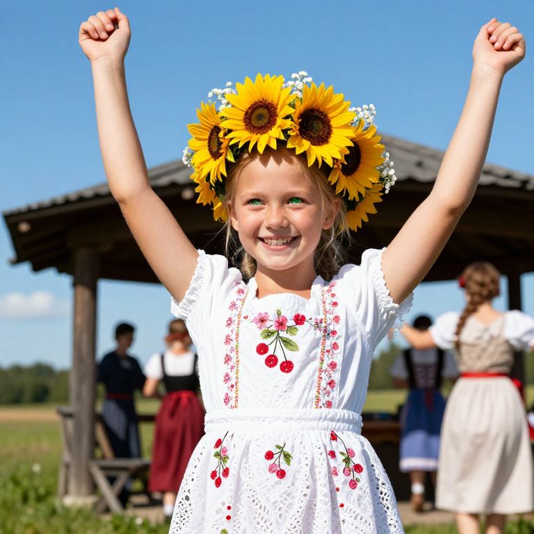 A joyful Swedish midsummer girl with smooth, fair skin, bright green eyes, and a playful smile stands in a rural Swedish countryside under a bright blue sky, wearing a white lace-like floral dress decorated with cherry blossoms and a large woven flower crown of sunflowers and baby's breath, with her hands raised in celebration, surrounded by friends dancing nearby under a traditional wooden pavilion.