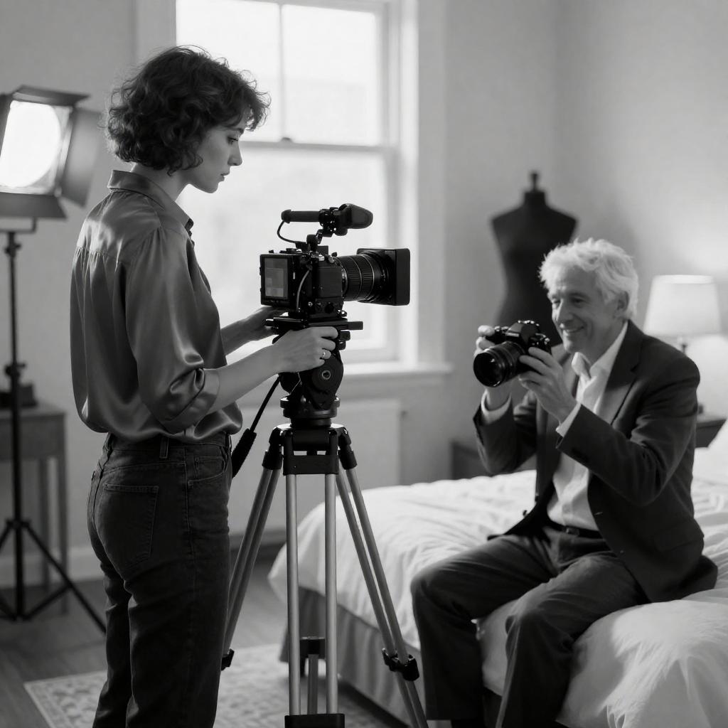 Black and white image of a female film crew member with short dark curly hair, wearing a silky blouse and dark pants, operating a camera mounted on a tripod. An older man with white hair, dressed in a suit, sits on a bed holding a camera and smiling. The setting includes a window, a mannequin, a lamp, and studio light sources, suggesting a creative indoor environment.