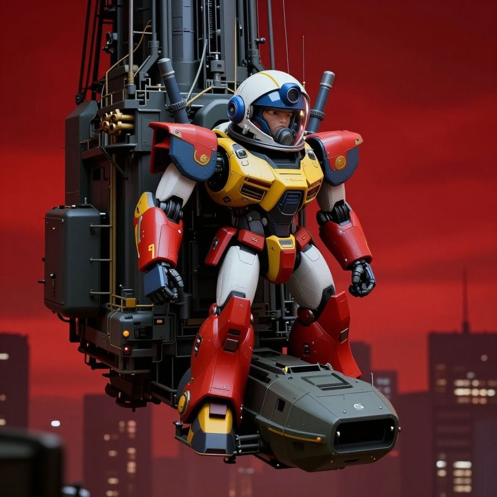 Digital artwork of a red, yellow, and white robotic mecha with armor details, floating above a cityscape against a red sky.