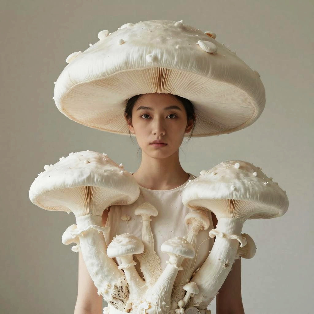 Woman wearing a white mushroom hat, oversized and sculptural, blending organic fungi elements with high fashion, textured fabrics, soft pastel palette, editorial style