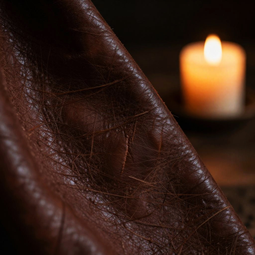 Whip marks on aged leather in dim candlelight, close-up texture, gritty detail, dramatic shadows, dark rustic background, intense and raw atmosphere, cinematic lighting