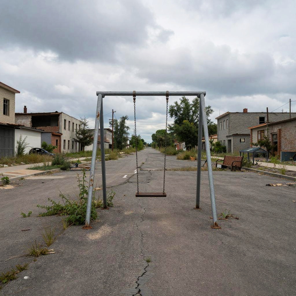 Abandonment in a desolate urban landscape, cracked roads and dilapidated buildings under a cloudy sky, overgrown weeds reclaiming the space, a lone rusty swing swaying in an empty playground, evoking deep feelings of isolation and neglect.
