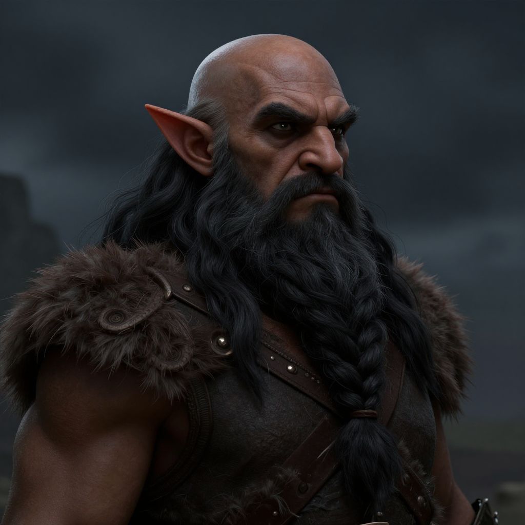 Close-up portrait of a grizzled hill dwarf man with brown skin, black hair turning gray, bald head, and a long braided beard. The dwarf wears rugged leather armor with fur shoulder pads, set against a dark, stormy background, embodying a fantasy character design style inspired by Dungeons and Dragons.