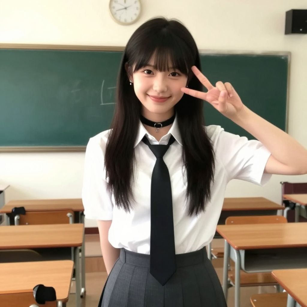 Anime-style digital drawing of a pink-haired girl in a school uniform, flashing a peace sign, with a classroom background.