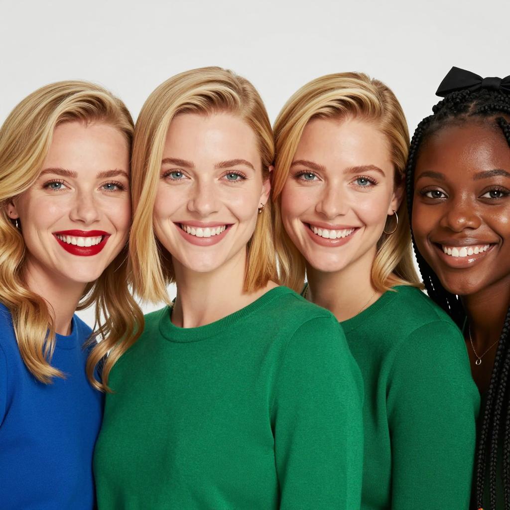 Five women standing close together, smiling. Blonde woman in center wears white satin tank top, others wear blue and teal tops. Blonde hair, brown hair, and dark brown hair. Hands on each other, light background. Casual, friendly setting.