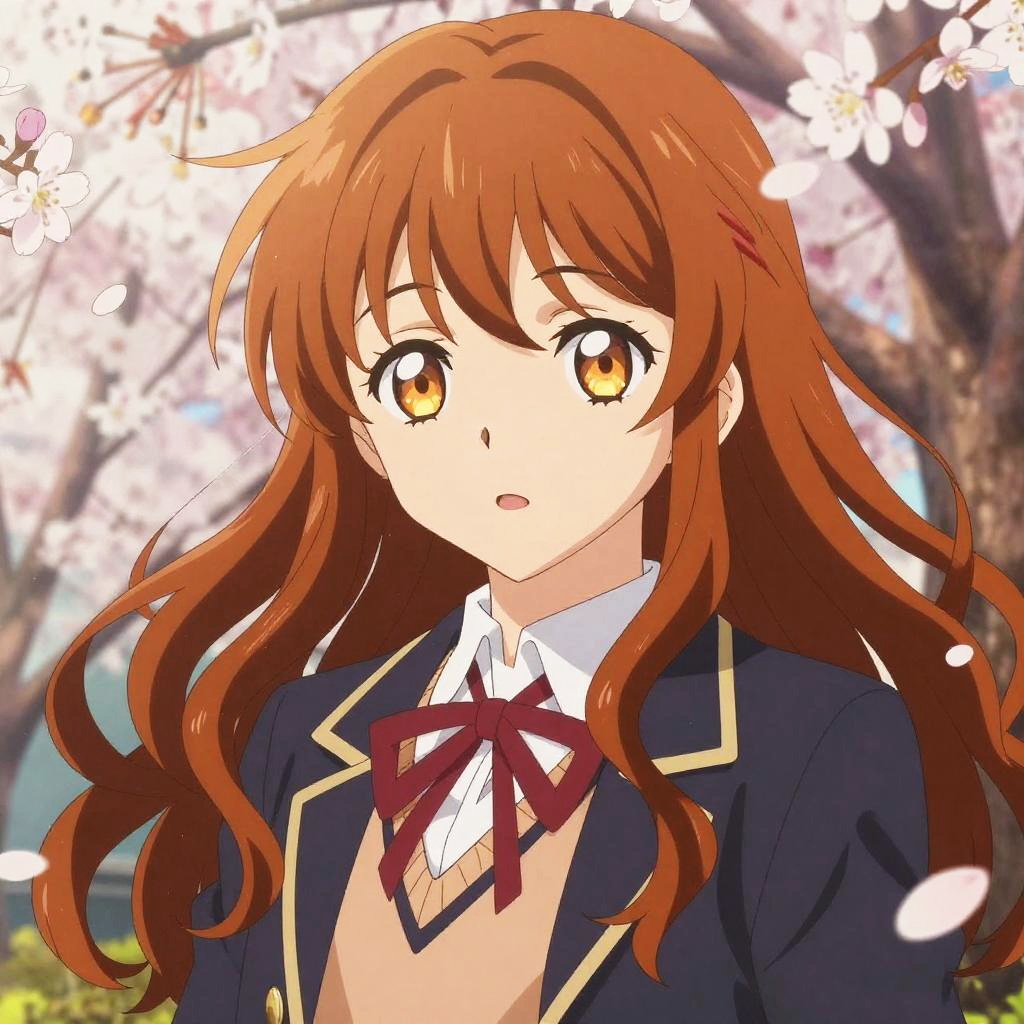 Hazel eyes anime character with flowing auburn hair, soft glowing light, intricate school uniform, gentle expression, cherry blossom background, vibrant detailed style