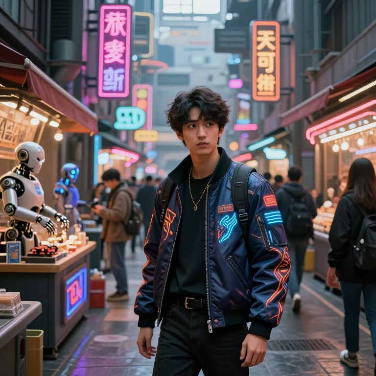Photograph of a young man with curly dark hair, wearing a black jacket adorned with neon blue and red geometric patterns, standing in a bustling neon-lit street market. He has a neutral expression and a backpack slung over one shoulder. The background features a variety of brightly lit stalls with colorful signs in Asian characters, a robot selling jewelry on the left, and several pedestrians, both men and women, walking through the narrow alley. The scene is vibrant and urban, with a mix of modern and retro elements.