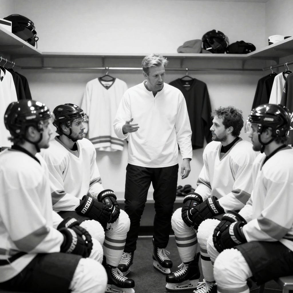 Black and white photograph of five male hockey players in locker room. One standing coach with short blonde hair, wearing white jersey and dark pants, speaking to seated players. Players wear striped jerseys and gloves, some with knee pads. Team jerseys hang on wall behind them. Players' expressions are neutral. Coach's right hand gestures while speaking. Background includes locker room shelves and walls.