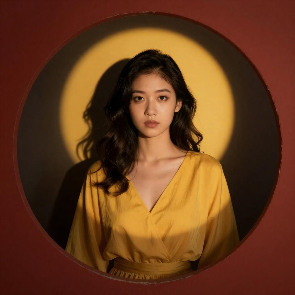 Photograph of a young woman with wavy dark hair, wearing a yellow, flowing top. Bright yellow halo surrounds her head, casting a shadow of a person in front. Red circular frame with rough edges. Dark background. Intense expression.