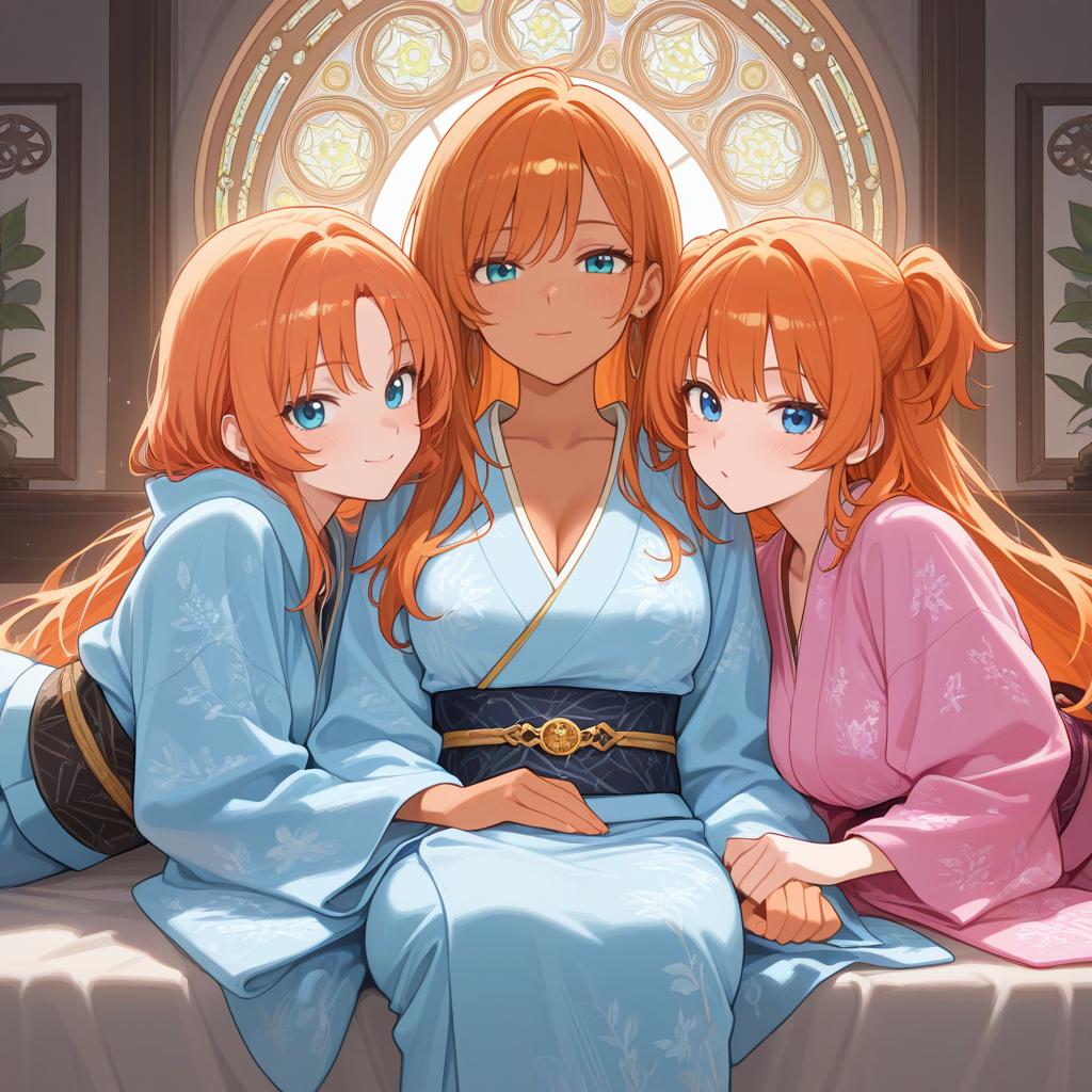Illustration of three anime-style girls indoors near an ornate art nouveau window. The group includes a dark-skinned female with blue eyes and dark hair in a blue silk kimono with hoop earrings, alongside two light-skinned girls with long orange hair and blue eyes wearing white silk kimonos. One orange-haired girl lies on a daybed while the other sits behind her, both with soft and relaxed expressions. The setting has warm peach tones and intricate decorative elements.
