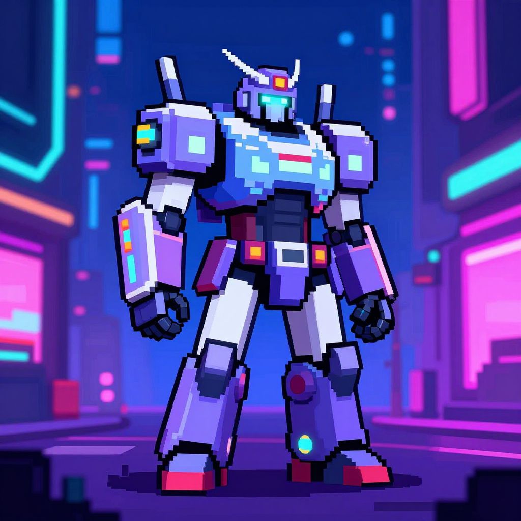 Pixel art 16x16 futuristic robot warrior standing in neon-lit cyberpunk city street, glowing details, vibrant color palette