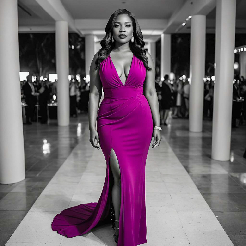 Photo of a Curvy Figure woman, Long Straight Hair, sexy outfit, form-fitting Magenta dress with a deep neckline and high slit, Chiffon fabric, black leather open-toe block heels, bold red lipstick, sleek hairstyle, modern glam, evening wear, at a gala, black and white photography