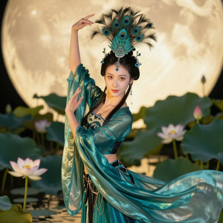 Digital artwork of an Asian woman in a teal, peacock-feathered headdress and flowing silk dress, dancing against a full moon and lotus