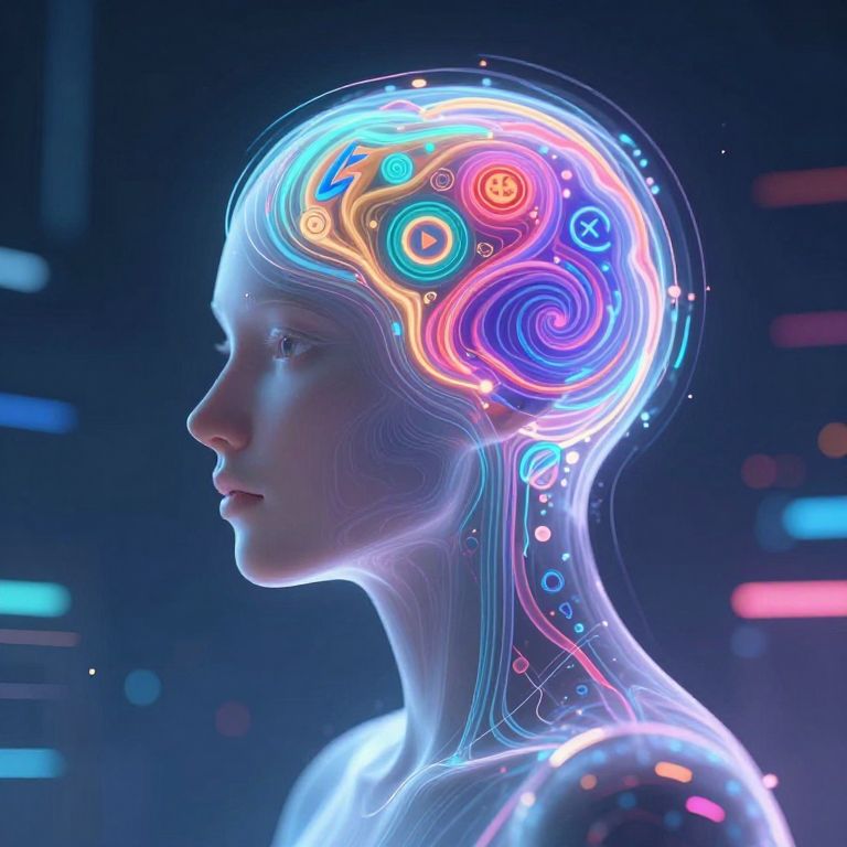 Digital art: A glowing, detailed human brain with neon lines floats above a vibrant, patterned crescent moon against a starry, purple cosmic sky