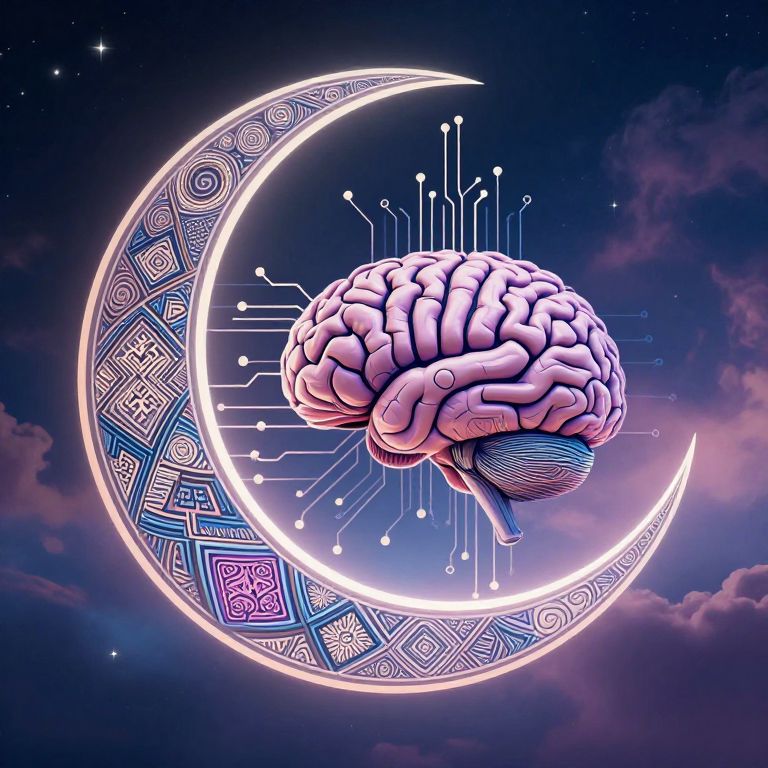 A digitally rendered image of a detailed, glowing white brain with intricate neural lines floating in front of a luminous crescent moon. The moon features geometric and patterned designs in white, blue, and pink hues. The background is a deep navy blue, transitioning to purple with star-like sparkles scattered throughout. The brain, centered in the image, is realistically textured and illuminated, contrasting with the more abstract, cosmic background. The overall style is surreal and futuristic, blending realism with digital art techniques.