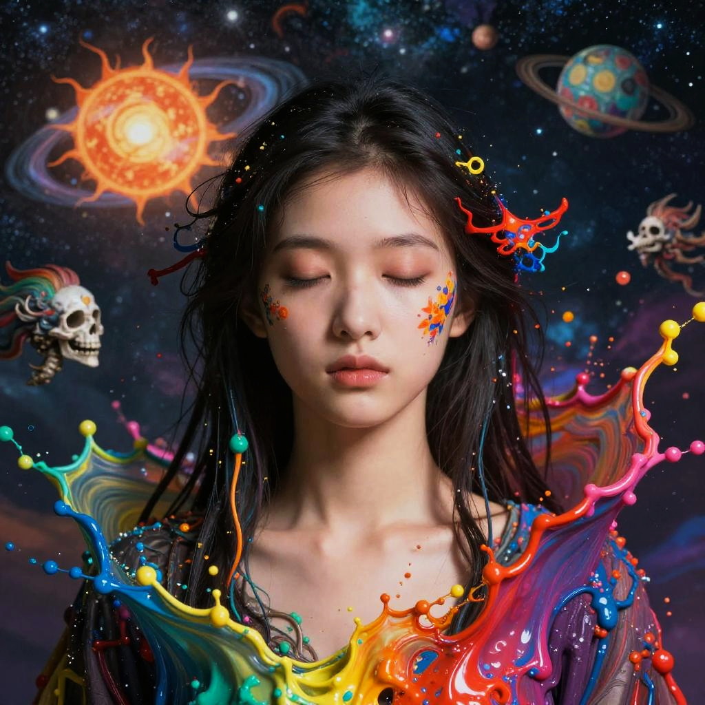 Ultra-realistic portrait of a young Asian woman with closed eyes, face adorned with small colorful paint splashes. She is surrounded by vibrant multicolored paint splashes that appear to float around her, blending into an abstract cosmic background featuring the solar system, Milky Way, and mythical creatures. The image evokes themes of Japanese mythology and fantasy, capturing a dreamlike atmosphere with intricate details and high resolution.