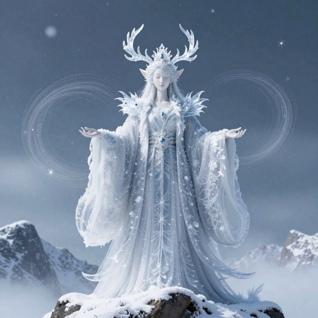 Snow deity, ancient spirit with crystalline antlers and flowing robes made of snow and ice, standing atop a mountain peak with swirling blizzards and sparkling frost patterns