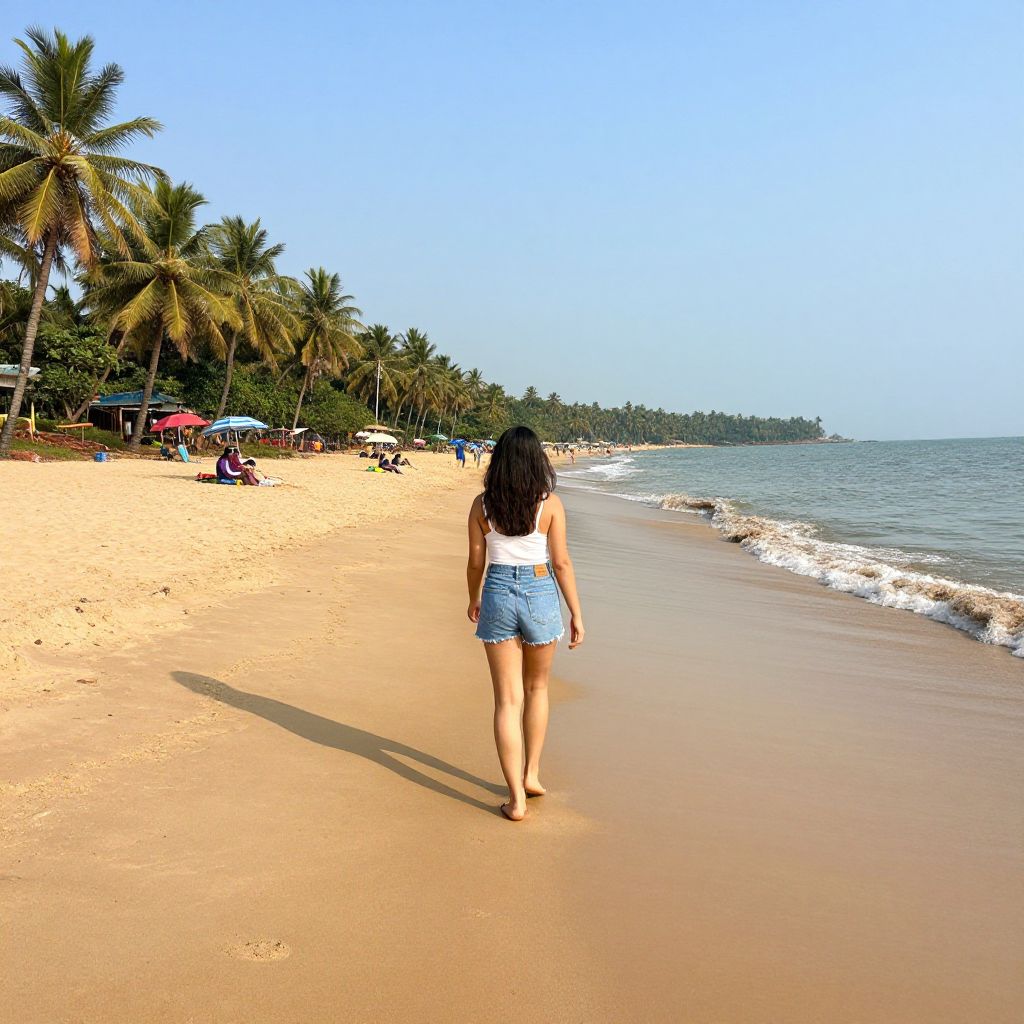 Sunny beach scene in Goa captures a woman walking along golden sand, surrounded by gentle waves, palm trees, and distant visitors enjoying peaceful activities under a clear blue sky.