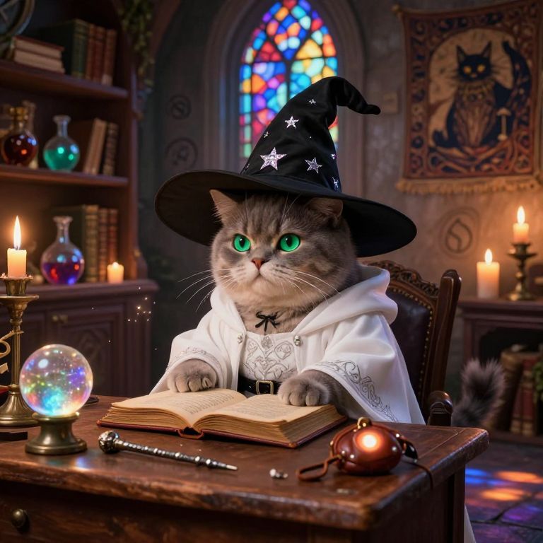 A plump, charming fat witch cat with fluffy gray fur, vibrant emerald-green eyes, and an air of mischief sits at a wooden desk in a dimly lit, mystical classroom, The room is lined with towering shelves of ancient tomes and illuminated by flickering candles, The cat wears a miniature flowing white robe with intricate silver embroidery, cinched with a tiny black belt, and a comically oversized pointed black hat adorned with shimmering stars that droops slightly over one ear, Its soft paws rest on a worn leather-bound spellbook, its eyes intently scanning the yellowed pages as its tail flicks lazily behind it, Scattered across the desk are strange, glowing artifacts and mystical tools, including a crystal orb reflecting faint rainbows, a pair of silver wand tips, and a small, leather-bound pouch emitting a soft, pulsing glow, The classroom walls are adorned with mystical symbols, shelves of vibrant potions, and faded tapestries showing scenes of ancient feline magic, Soft, warm light streams through stained glass windows, casting a kaleidoscope of colors across the stone floor, while the cat occasionally pauses to bat at a floating spark of magical energy, adding a touch of whimsy to the arcane setting