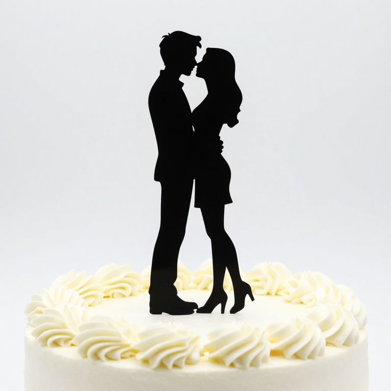 Silhouette cake topper featuring a black acrylic couple design gracefully kissing, positioned centrally atop a smooth white cake adorned with evenly spaced cream swirls around its perimeter.