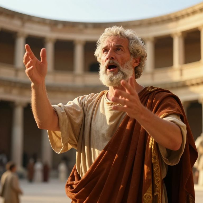 Eloquence expressed through a majestic speaker at a grand ancient amphitheater, vivid emotions radiating from the face, dynamic hand gestures, warm golden sunlight illuminating the scene, rich classical attire, detailed expressions of passion and persuasion.