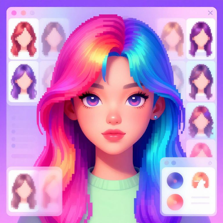 Test hair color online, creative concept art of a digital avatar with interchangeable hair hues, pixel art style blending vibrant neon colors with smooth gradients, holographic UI overlays displaying hair dye choices