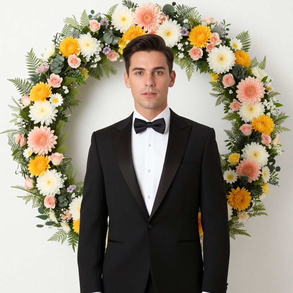 Flower Power Costume Male, man in a tuxedo standing in front of a wreath of flowers