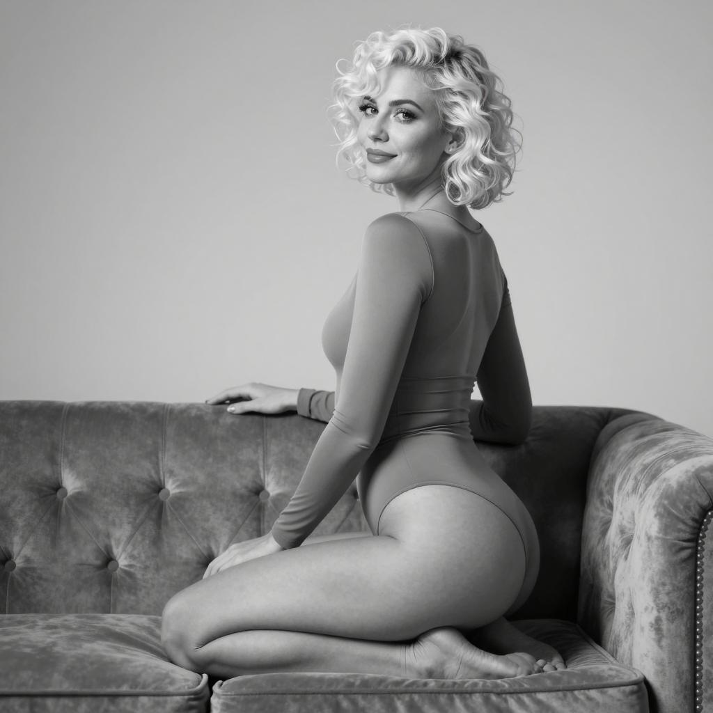 Black-and-white photograph of a slender woman with short, curly blonde hair seated on a tufted upholstered sofa. She wears a long-sleeve, high-cut one-piece outfit and looks confidently over her shoulder with a subtle smile. The softly lit gradient background creates a minimalist and elegant atmosphere.