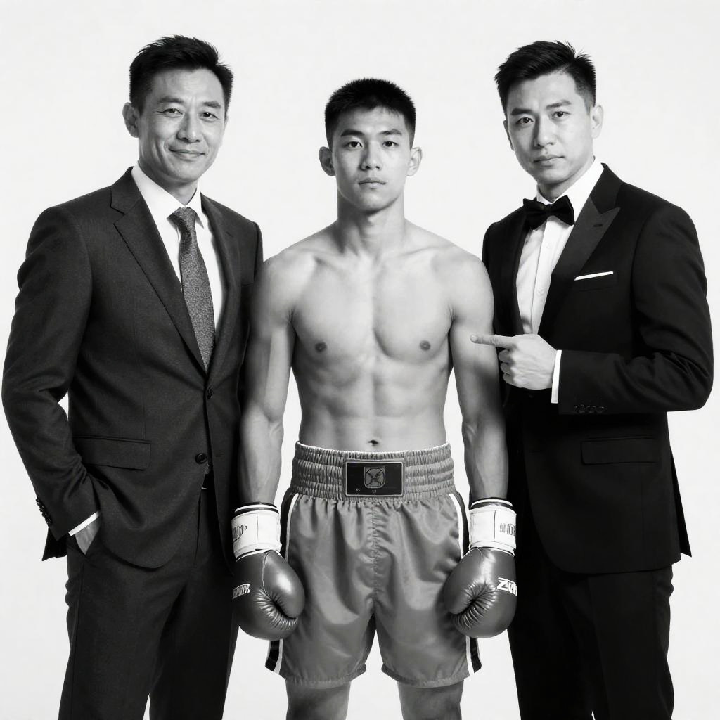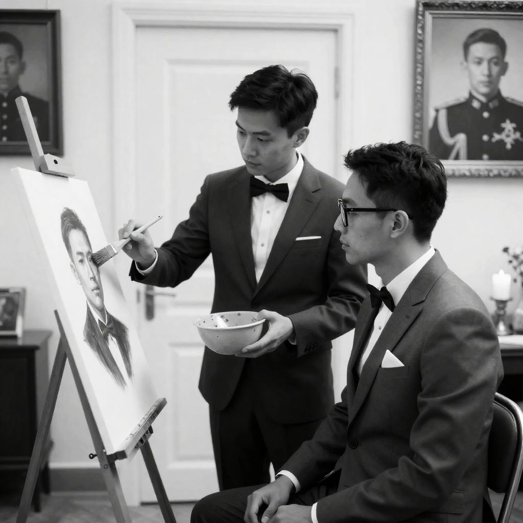 Black-and-white photograph of two men in suits. One stands, holding a brush and mixing bowl, painting the seated man's portrait. Seated man wears glasses, bow tie, pocket square. Background: closed door, framed portrait of uniformed man. Candle on table.