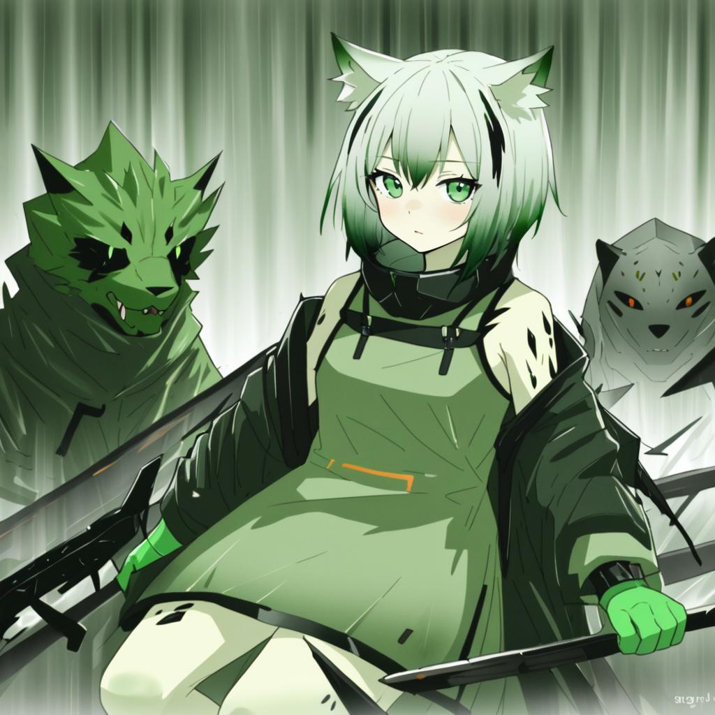Mon3tr (arknights), arknights, 1girl, cat girl, monster, cat ears, animal ear fluff, green eyes, short hair, green hair, grey hair, white hair, green dress, bare shoulders, long sleeves, oripathy lesion (arknights), by artist katagiri hinata, anime