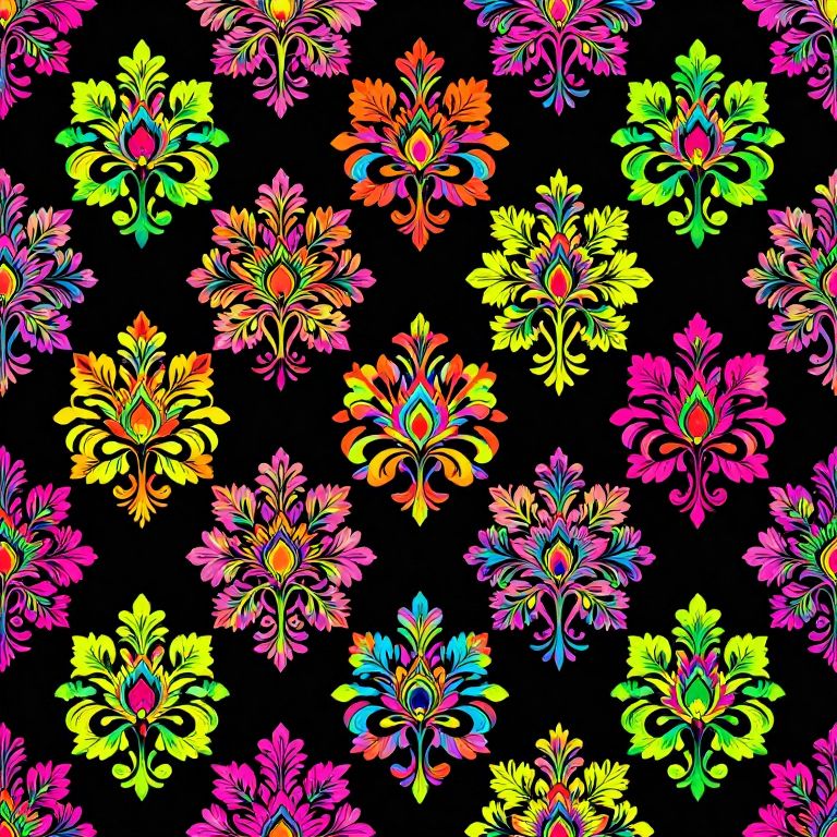 Symmetrical floral damask design radiates vibrant neon hues against a stark black background, blending traditional patterns with modern fluorescent colors.