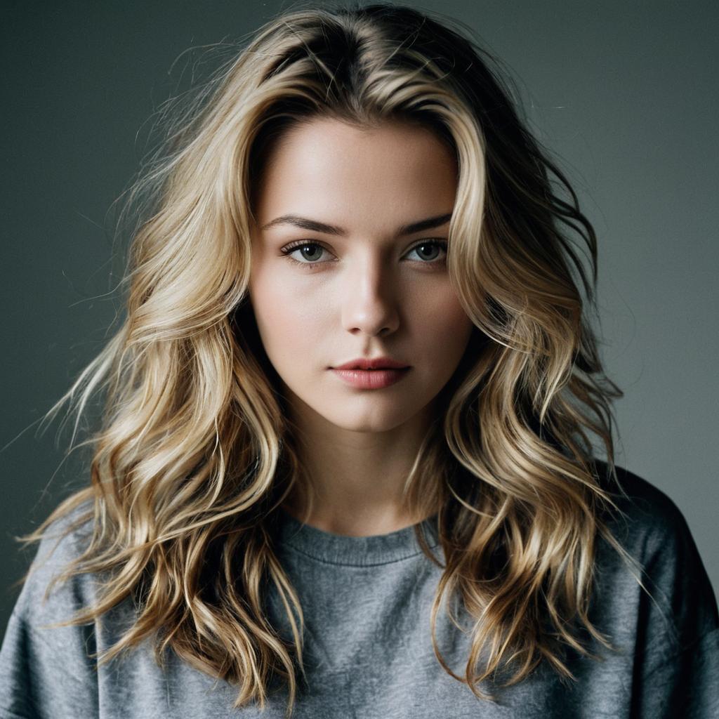 Flipped ends hairstyle,1girl, solo, realistic, long hair, looking at viewer, shirt, upper body, lips, photorealistic, messy hair, wavy hair, blonde hair, brown hair, grey shirt, closed mouth, blurry
