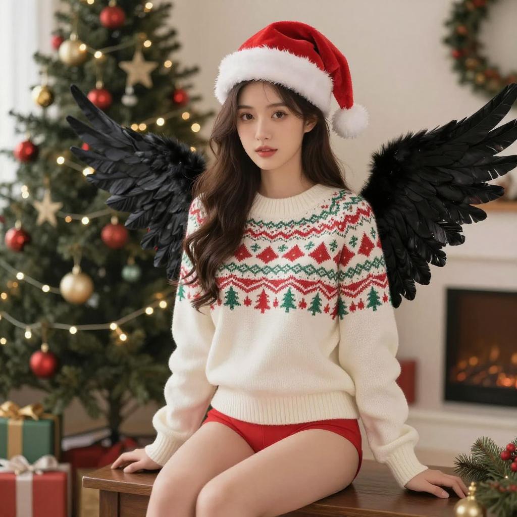 Photograph of an Asian woman with long dark hair, wearing a red Santa hat, white Christmas sweater with red and green patterns, and red panties. She has large black feathered wings and sits on a wooden table in a festive living room. Background includes a decorated Christmas tree with red and gold ornaments, a lit fireplace, and wrapped gifts. The woman has a calm expression and light skin. The scene is brightly lit with warm, festive colors.