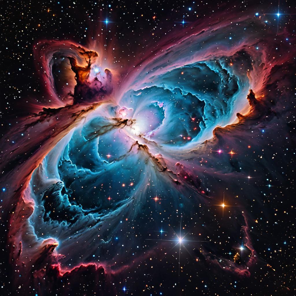 A digitally enhanced, vivid 3D star map of the Orion Nebula featuring surreal, holographic runes overlaid in a holographic style. The nebula is depicted in rich blues, purples, and reds with intricate star details and glowing cosmic clouds creating a mystic and otherworldly atmosphere.