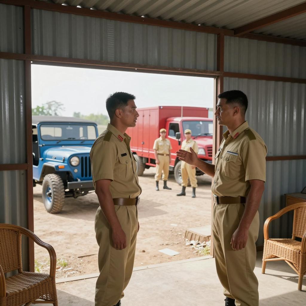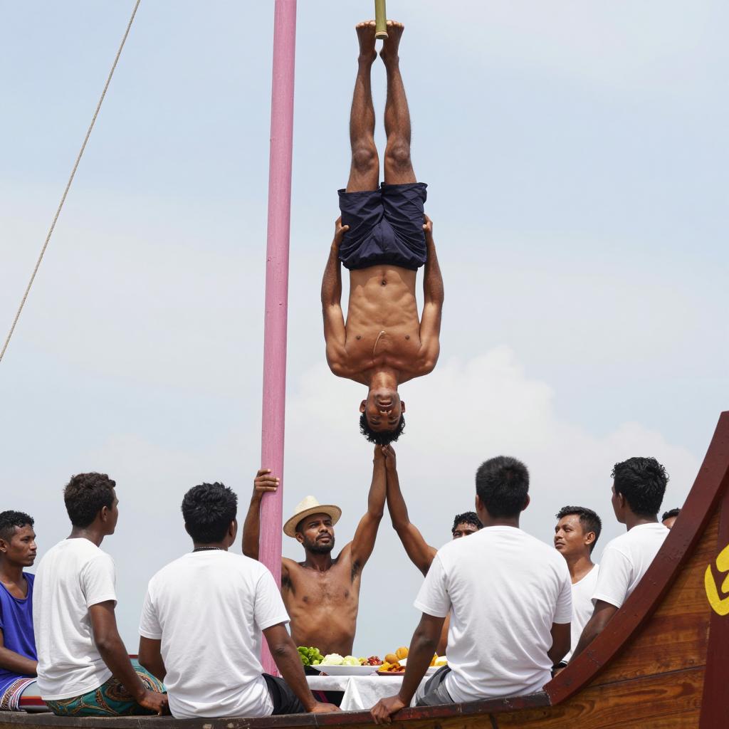 Two men in a wooden, open-sided hut by the water. The man on the left, with a muscular build, beige shirt, and white pants, stands with his back to the camera, right arm raised. The man on the right, with a grey head, wears a blue and white striped shirt, seated at a wooden table. Water and rocky shoreline in the background. Cloudy sky.