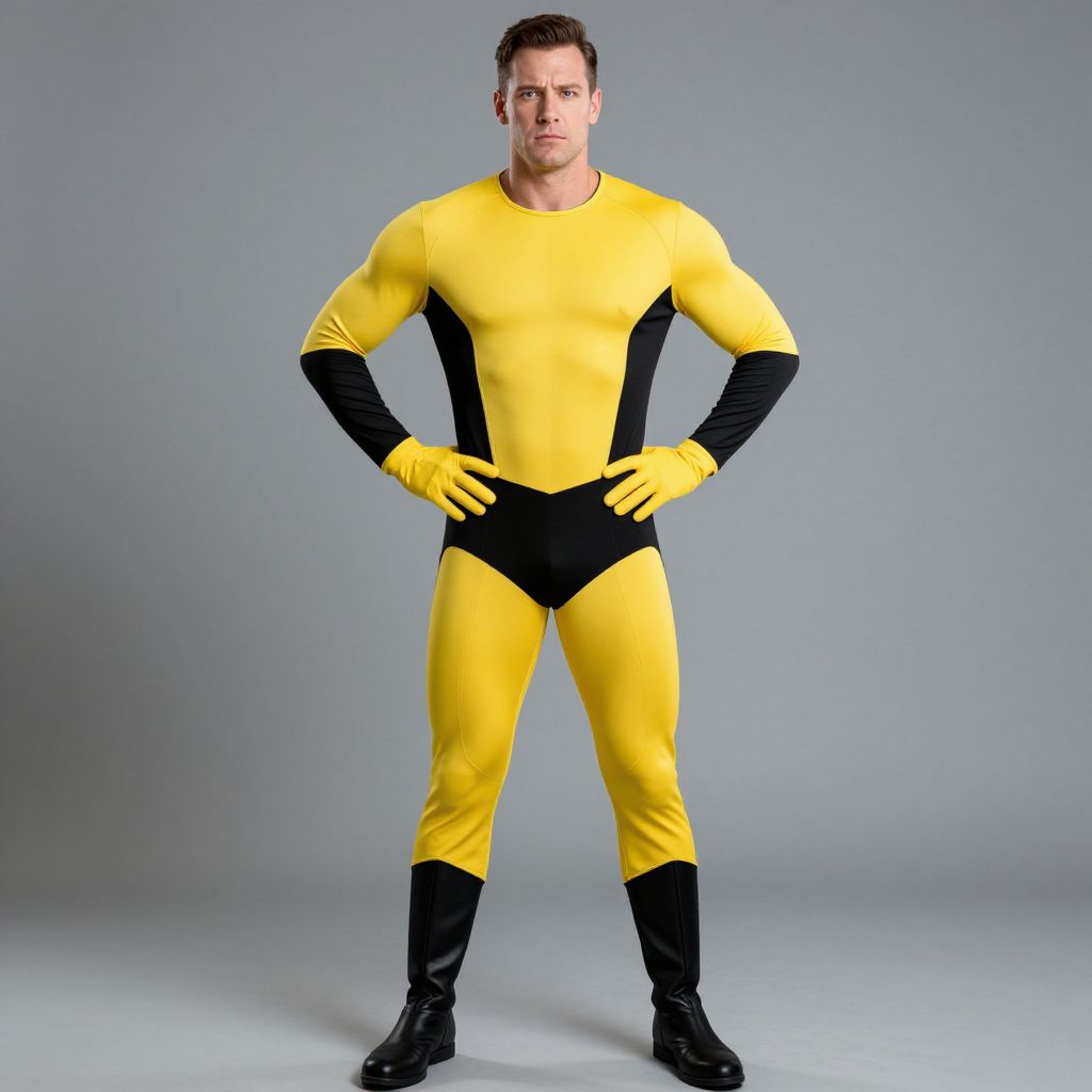 Photograph of a muscular, fair-skinned man with short brown hair, standing confidently against a plain gray background. He wears a tight, yellow and black superhero-style bodysuit with black gloves and boots, highlighting his athletic build. The bodysuit has black panels on the sides, sleeves, and crotch area, and he stands with hands on his hips, exuding a strong, heroic presence. The lighting is even, eliminating shadows and emphasizing the bright colors of his outfit.