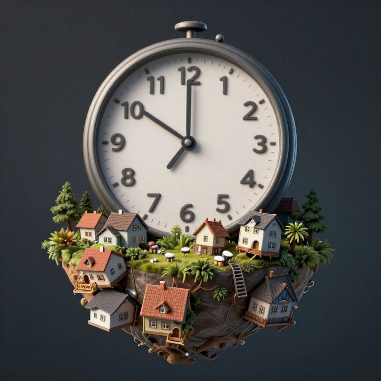 On this floating island, gravity only works during odd-numbered hours, causing houses to collapse and rise rhythmously.
