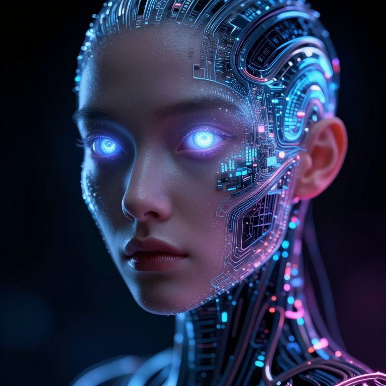 Cybernetic portrait of a woman with glowing blue eyes, intricate circuitry integrated into her face and hair, against a dark background. Digital art