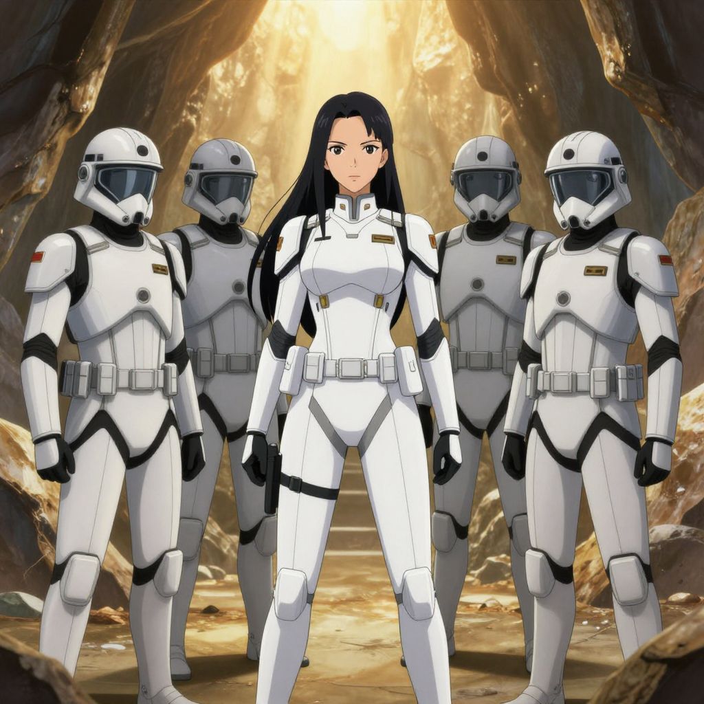 Digital anime-style illustration of a confident woman in a white spacesuit, flanked by three white-armored stormtroopers in a sunlit cave.