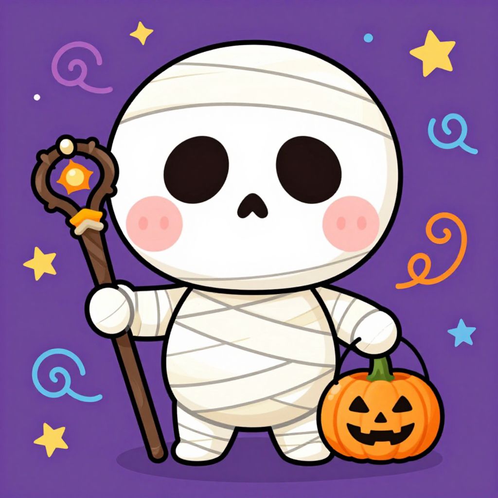 Illustration of a cute cartoon mummy character with a big smiling skull face, wearing a striped mummy costume and holding a pumpkin-shaped Halloween bucket. The character has rosy cheeks and is holding a staff with a decorated top. The background is purple with colorful stars and swirls, creating a festive Halloween atmosphere.