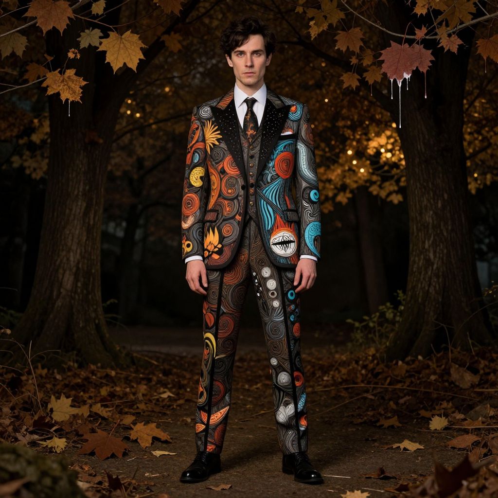 Photograph of a young man in a vibrant, psychedelic-patterned suit with colorful swirls and shapes, standing in a dark, autumnal forest.